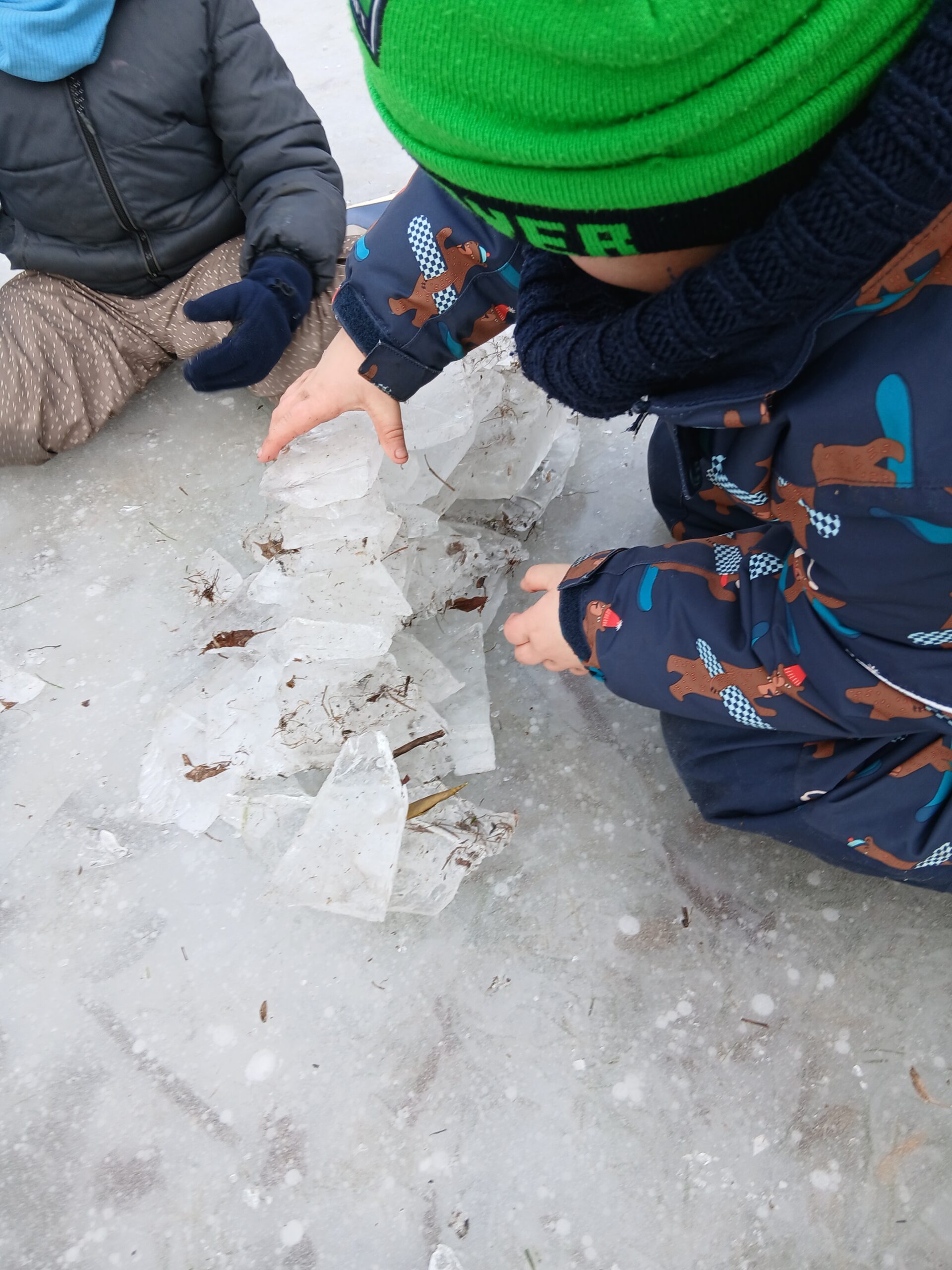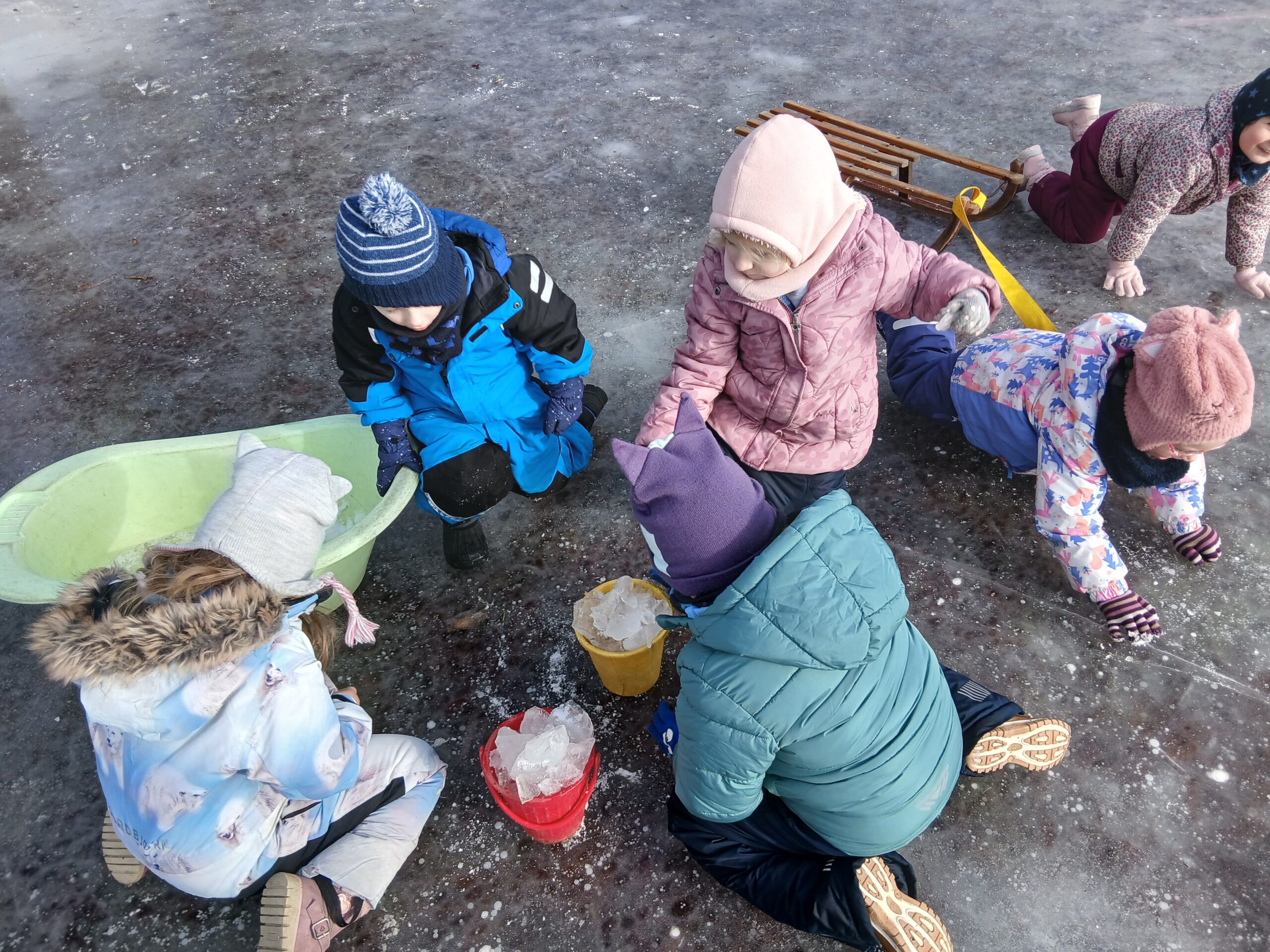 Wir malten den Schnee mit Farben an, stellten kleine Eisbomben her und beobachteten, wie Wasser zu Eis gefriert. Wir spürten den Unterschied zwischen Pulverschnee und nassem Schnee und erforschten, wie lange Eis braucht, um zu schmelzen.
